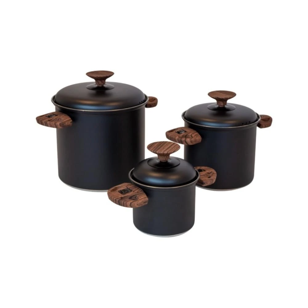 Misschien wel de mooiste Pannenset van Bo–Camp: de Industrial Hading Compact in een 2-delige en 3-delige set. Wie zegt dat koken alleen praktisch moet zijn? De zwarte rvs-pannen hebben een stoere industriële look met elegante houten handgrepen en dekseldop. De handgrepen zijn eenvoudig in te klappen waardoor het nog makkelijker stapelen is in de keukenkastjes. Stijlvol op de camping tot in de keuken. Door het roestvrij staal zijn ze ook geschikt voor inductie kookplaten. Misschien ook leuk voor thuis.