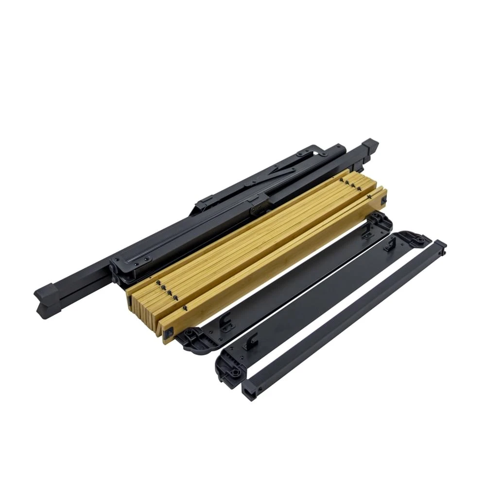 Naast de grotere Maryland variant van 111 x 72 is deze Camping Roltafel van Bo–Camp net iets compacter, maar nog steeds met de stoere uitstraling van een zwart frame en een mooi afgewerkt bamboe tafelblad. Behalve dat hij bij elke tent fantastisch zal staan heeft deze campingtafel ook het grote voordeel dat compleet en eenvoudig uit elkaar gehaald kan worden en daardoor heel erg compact op te bergen is. Dus als je nog ergens een gaatje hebt tussen alle andere bagage dan zal deze daar makkelijk tussen passen. De gekruiste poten zorgen voor extra stevigheid en door de verstelbare poot is het mogelijk om de tafel ook op ongelijke grond mooi recht te zetten.