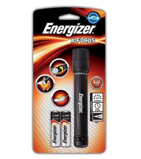 De Energizer X-Focus zaklamp is een lamp met een speciale focus lens. Door aan deze lens te draaien kun je de lichtstraal variëren tussen een felle smalle stip tot een brede minder felle bundel. Zo kun je de lichtbundel aanpassen naar wat jij nodig hebt. Daarnaast is de X-Focus ook waterdicht en voorzien van een anti-slip handgreep. Aan de achterkant van de zaklamp is een oog aangebracht waar evenueel een handlus aan bevestigd kan worden.